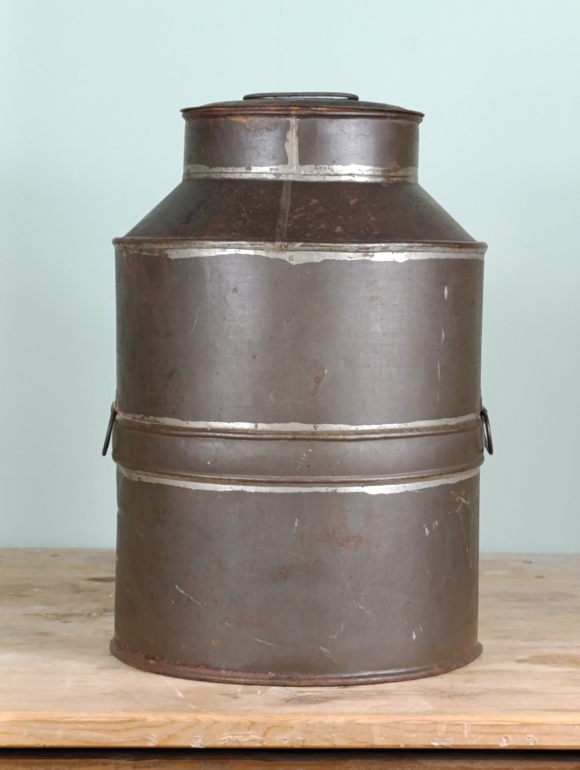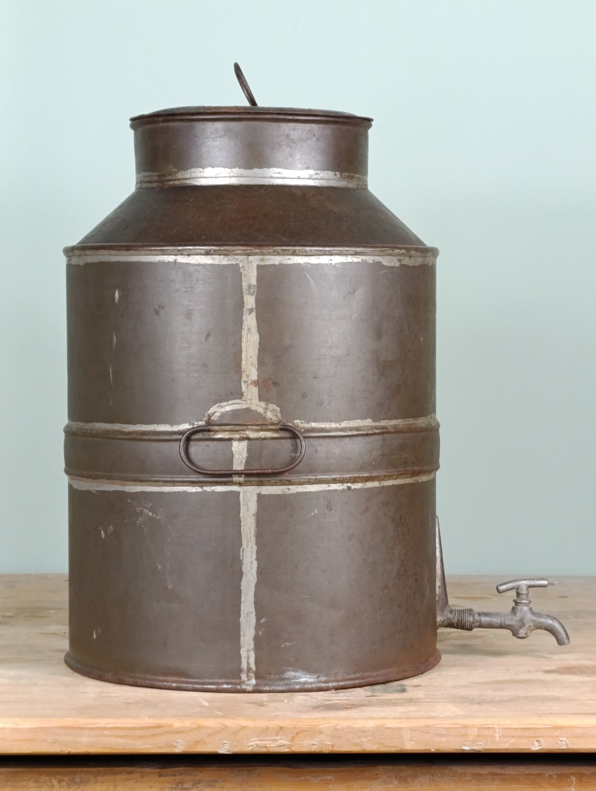 Las antiguas zafras aceiteras eran el alma de las despensas mediterráneas. Esta pieza metálica conserva su grifo original, intacto y funcional, evocando el ritual de servir el aceite en cocinas de antaño. Su diseño robusto y práctico lo convierte en un objeto con carácter, perfecto para quienes valoran la autenticidad. Un objeto que puede lucirse en cocinas rústicas, bodegas, o incluso como pieza protagonista en una estantería vintage.