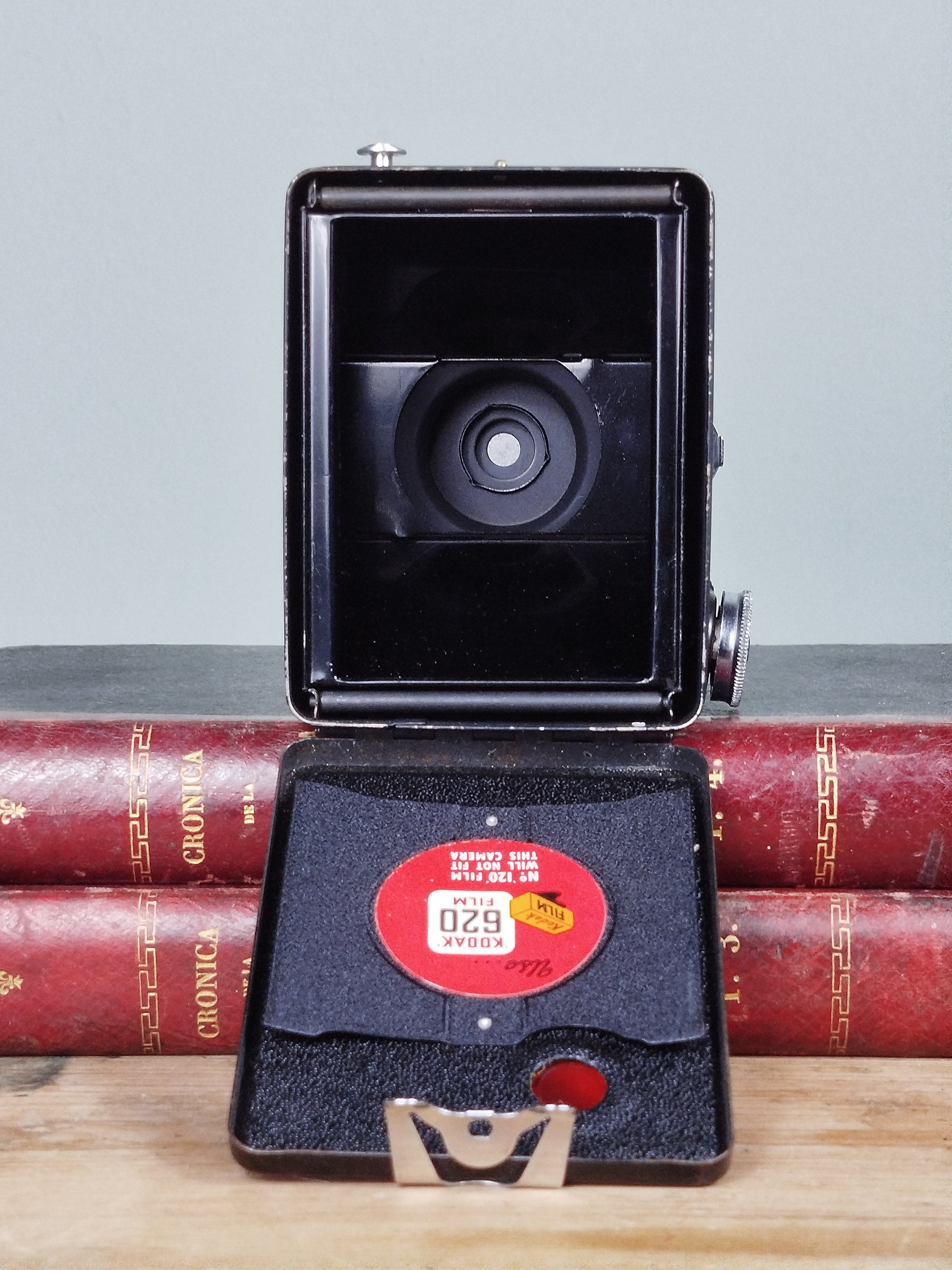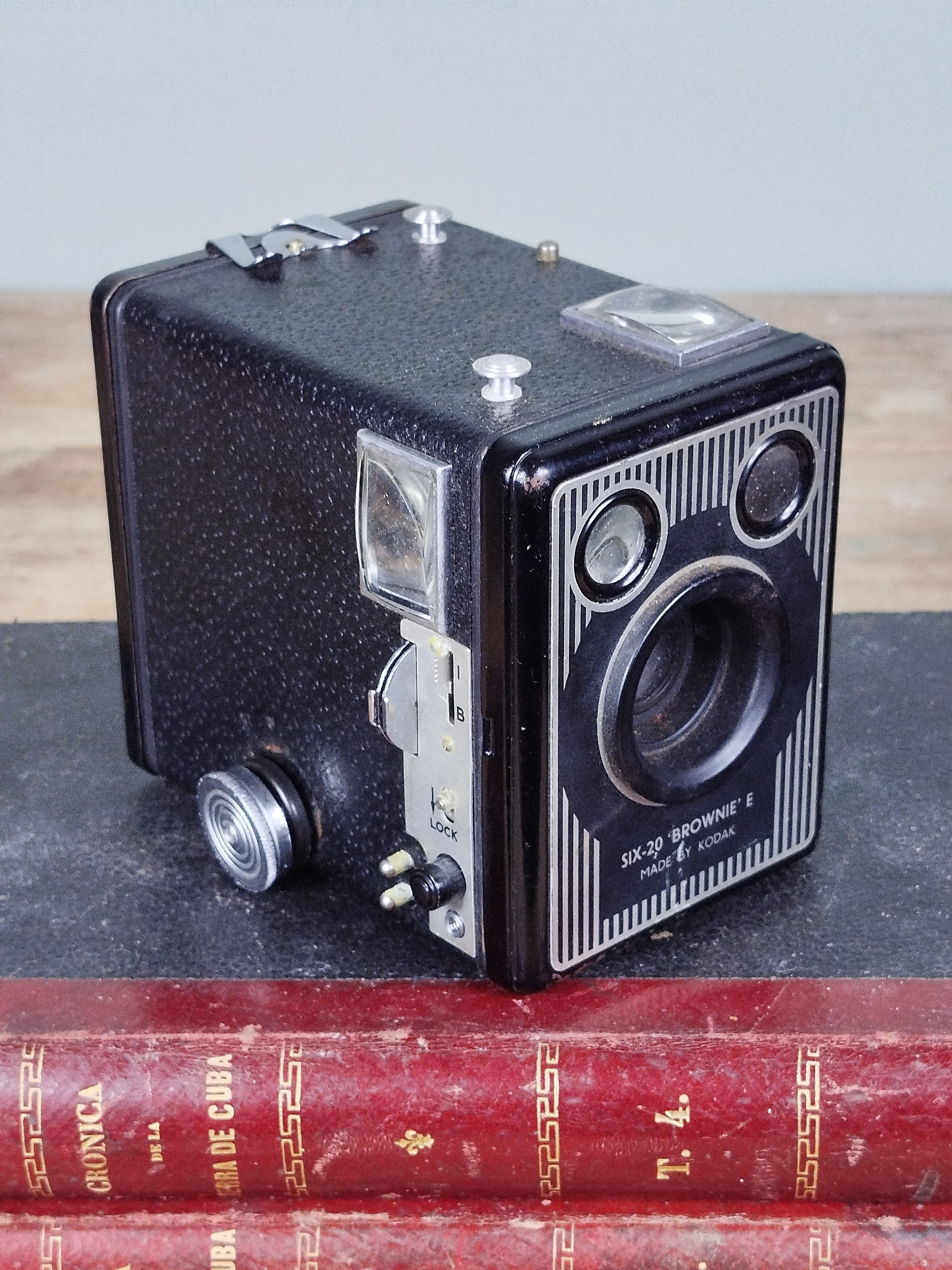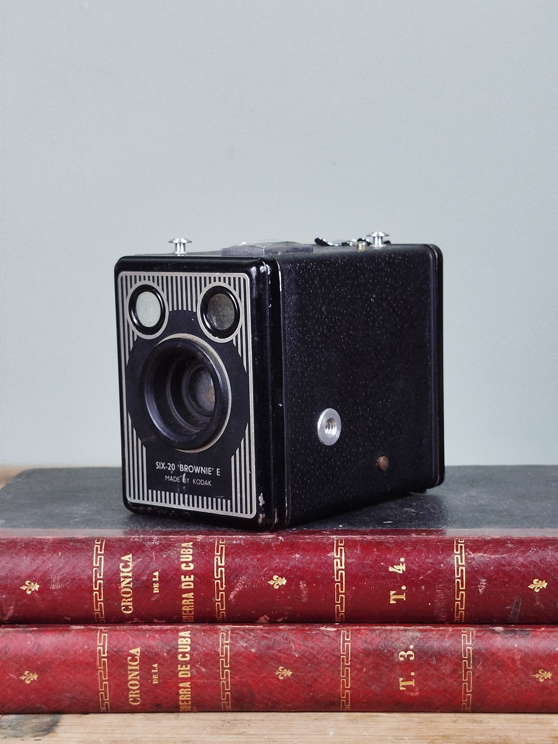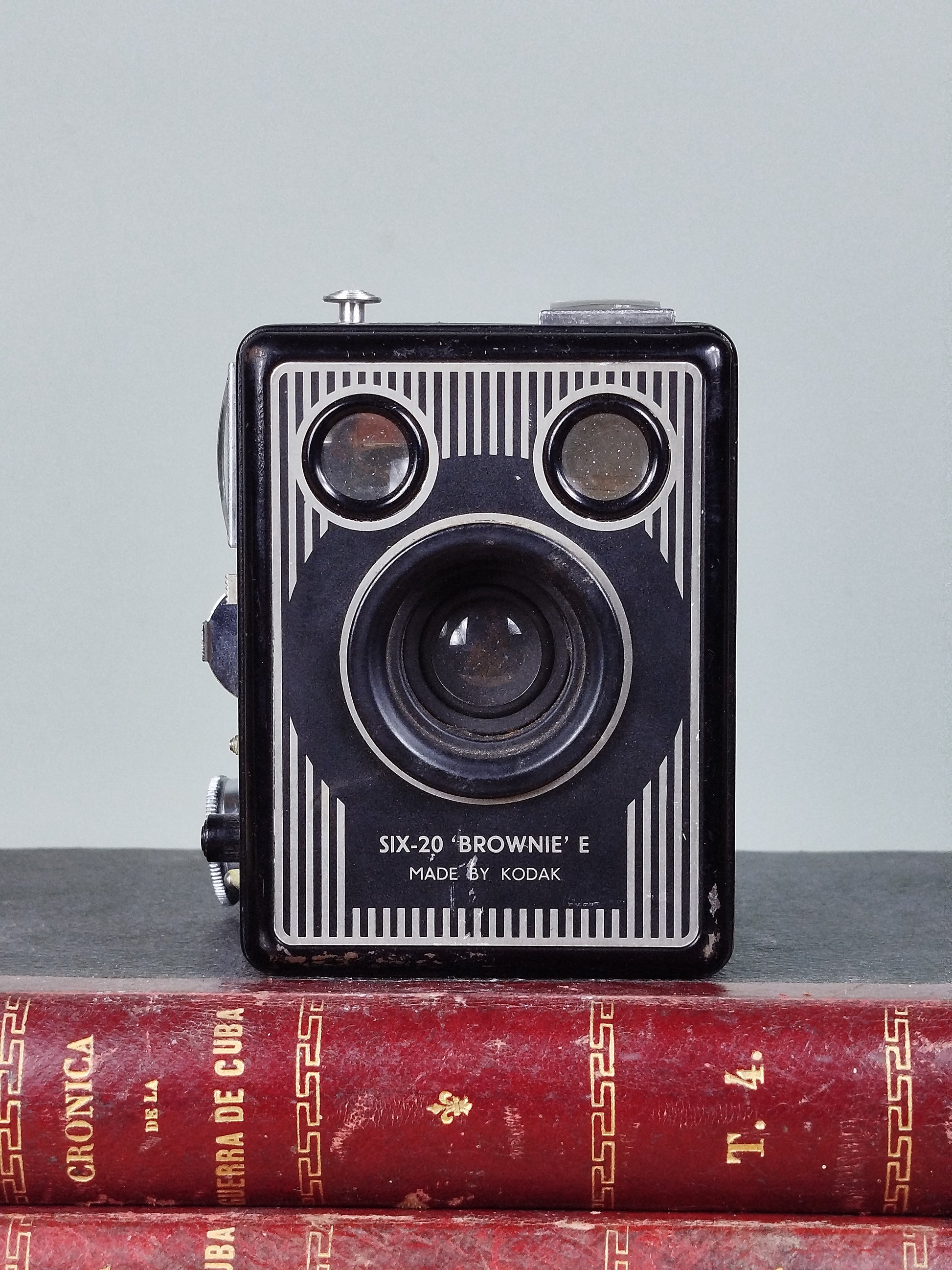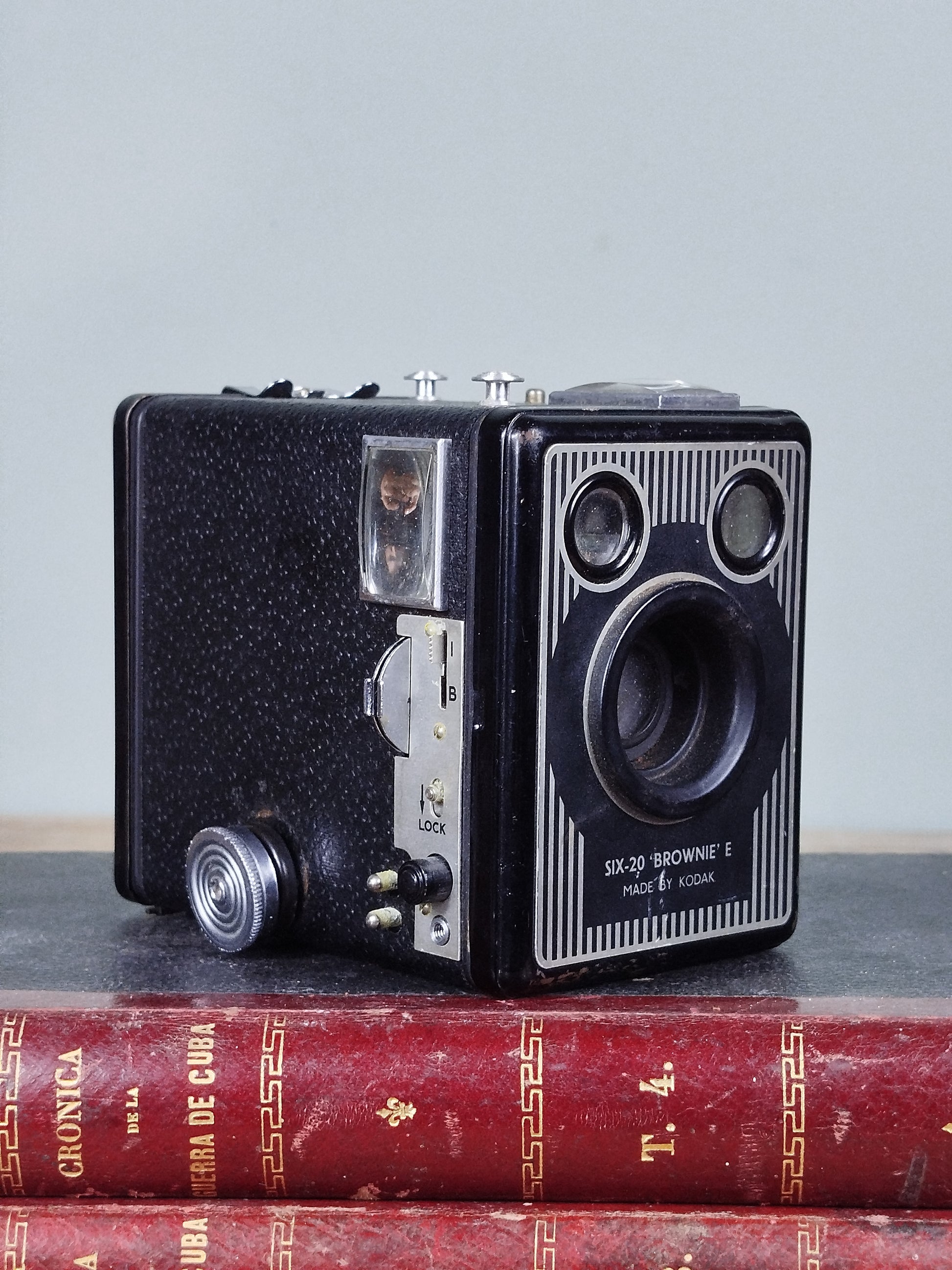 Diseñada para hacer la fotografía accesible al público general, la Brownie Modelo E forma parte de una historia que democratizó la memoria visual. Su cuerpo robusto y su sencillez la convirtieron en testigo silencioso de momentos familiares que hoy viven en álbumes y cajones. Sugerencia decorativa: Dimensiones: 12 x 8 x 10 cm