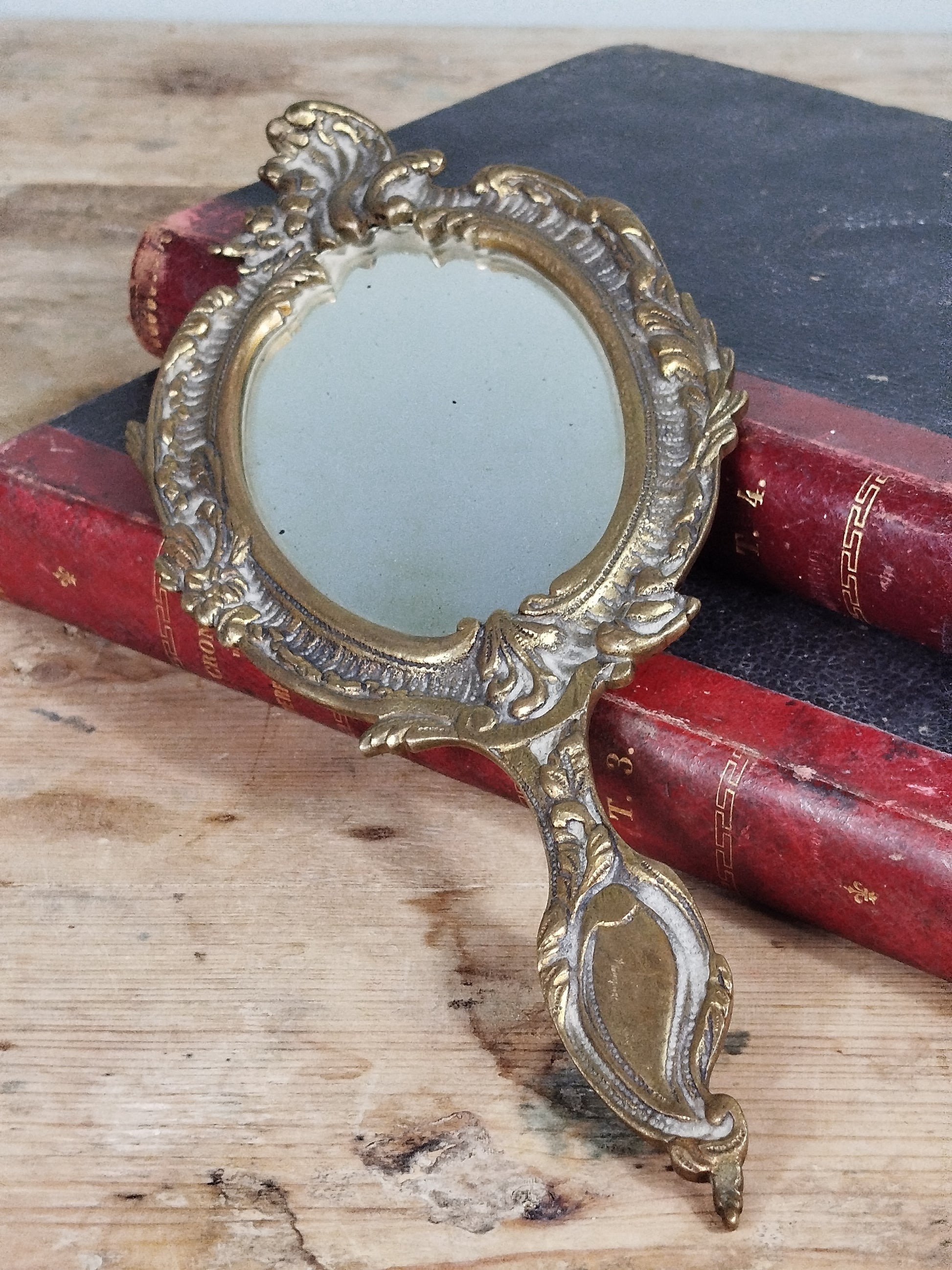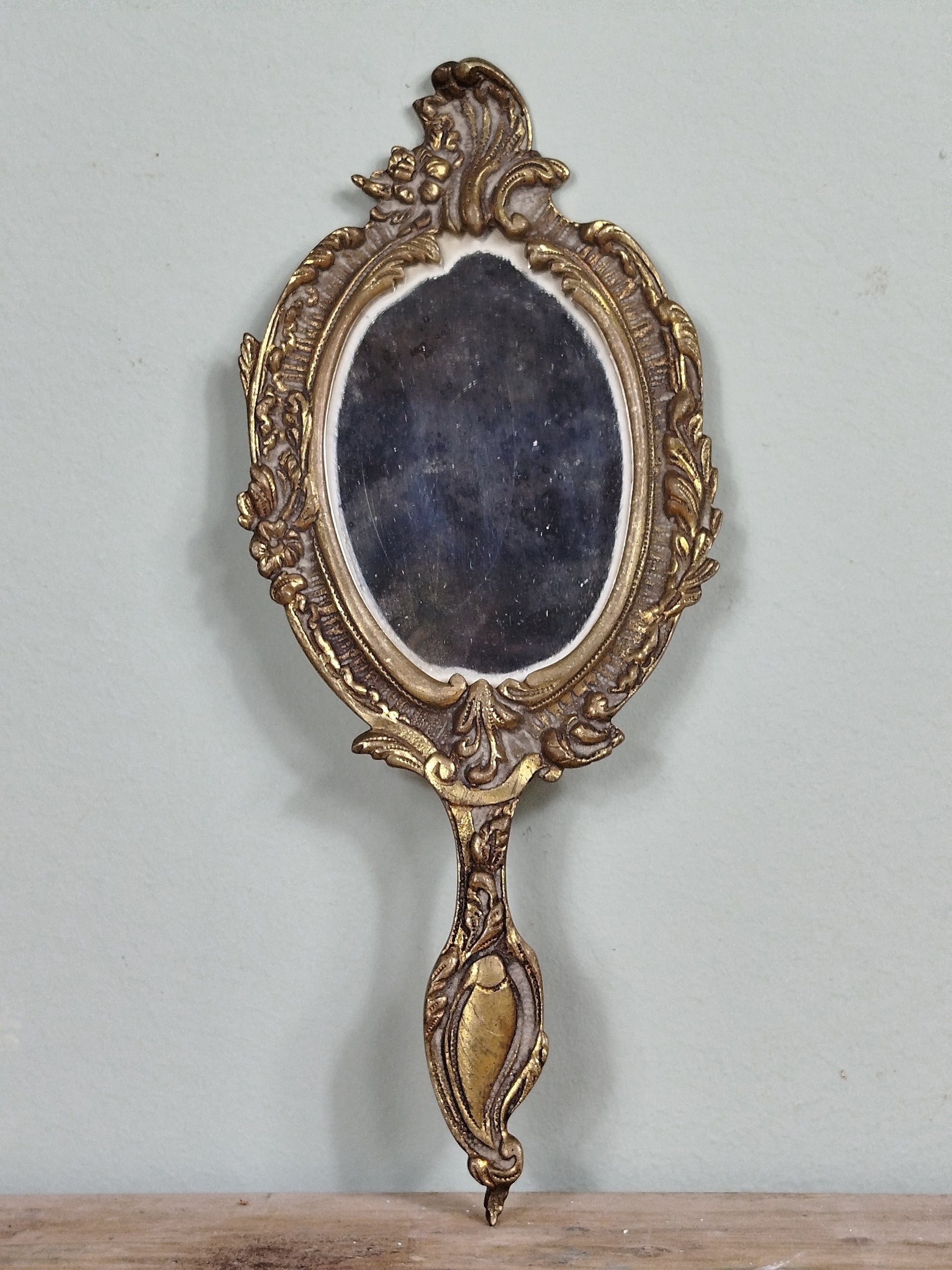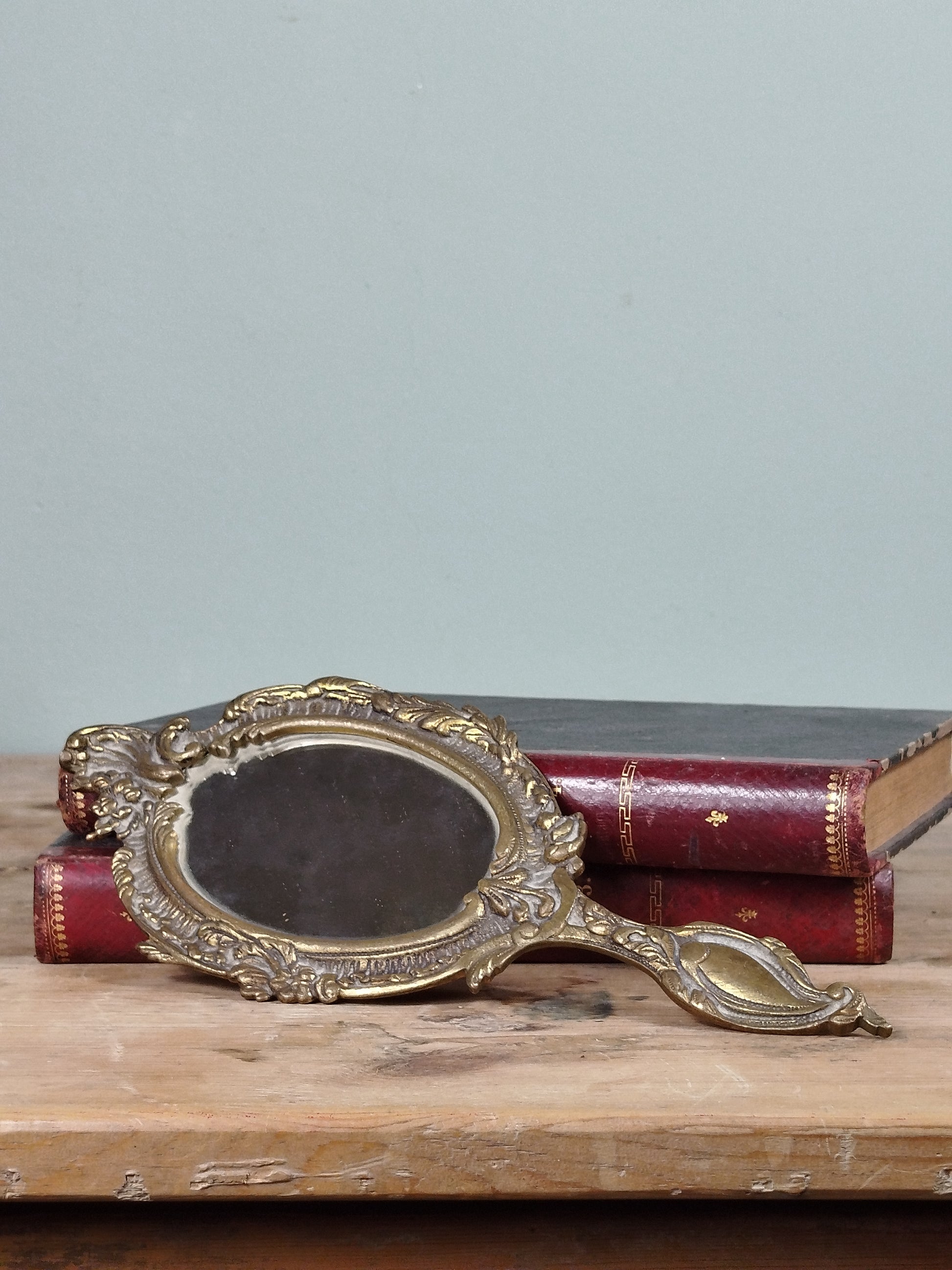 Este espejo de mano, elaborado en bronce con detalles ornamentales, evoca la delicadeza de los tocadores de época. Fue el reflejo de mujeres que cuidaban de sí mismas con rituales pausados y cotidianos. Sugerencia decorativa: Dimensiones: 27 x 11 cm