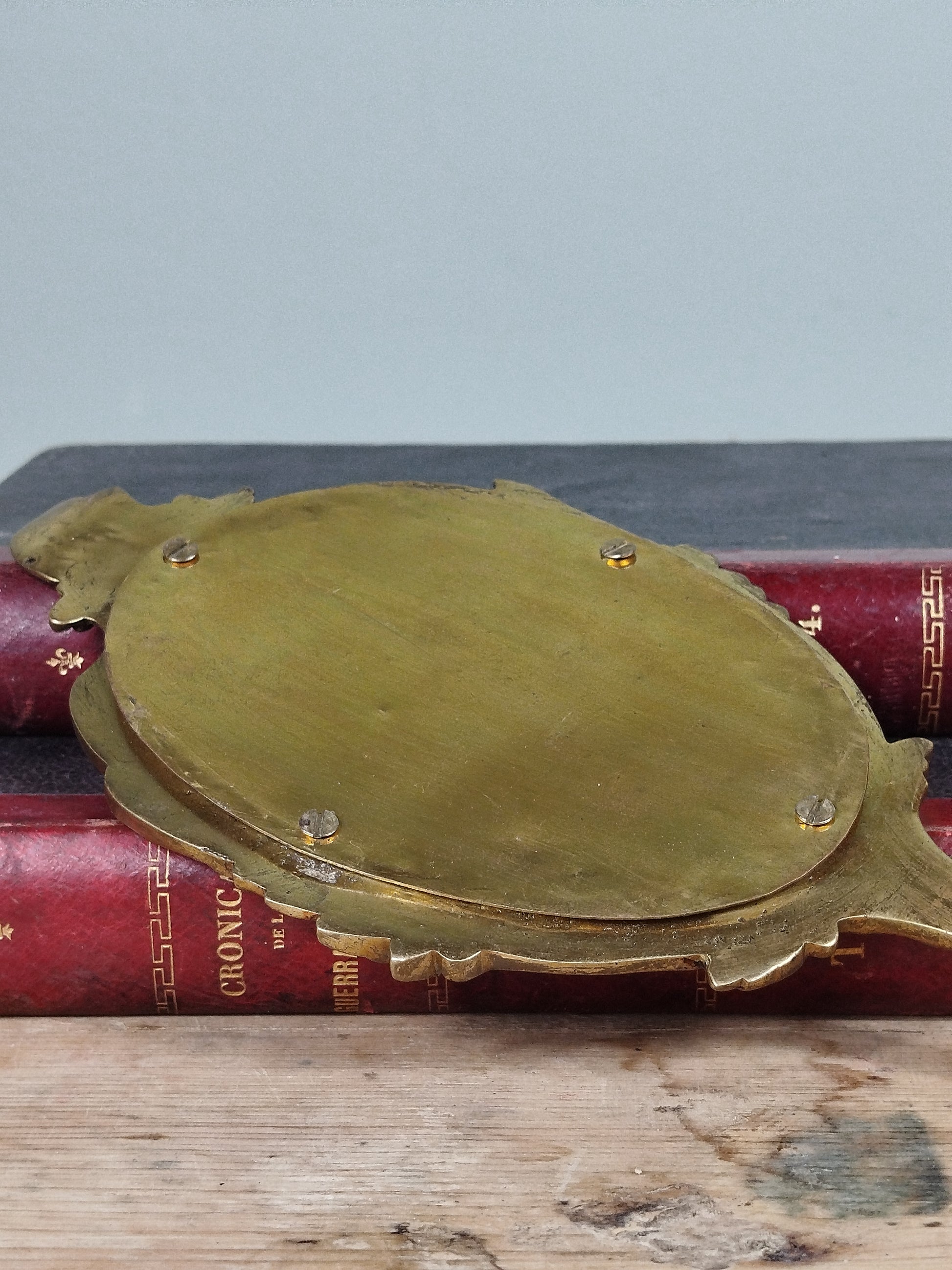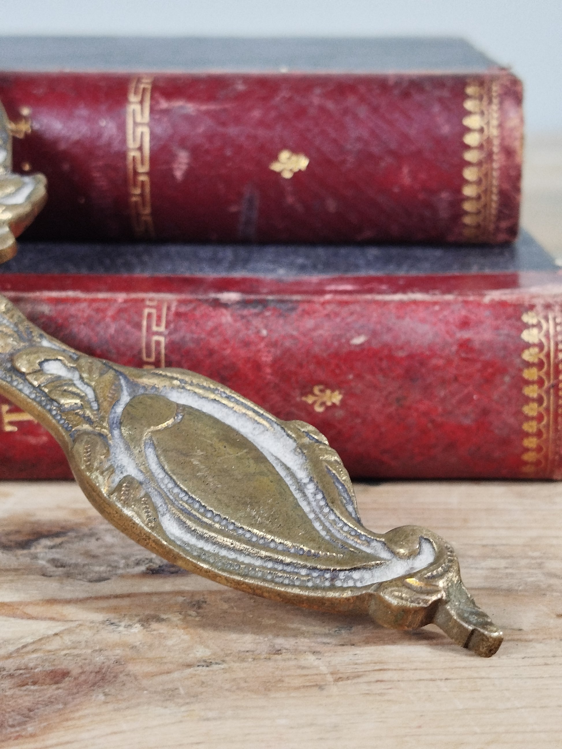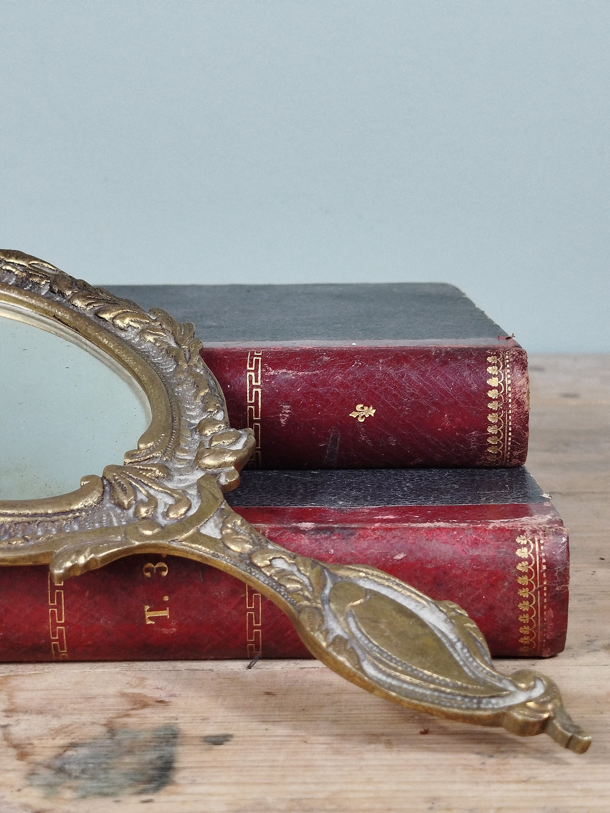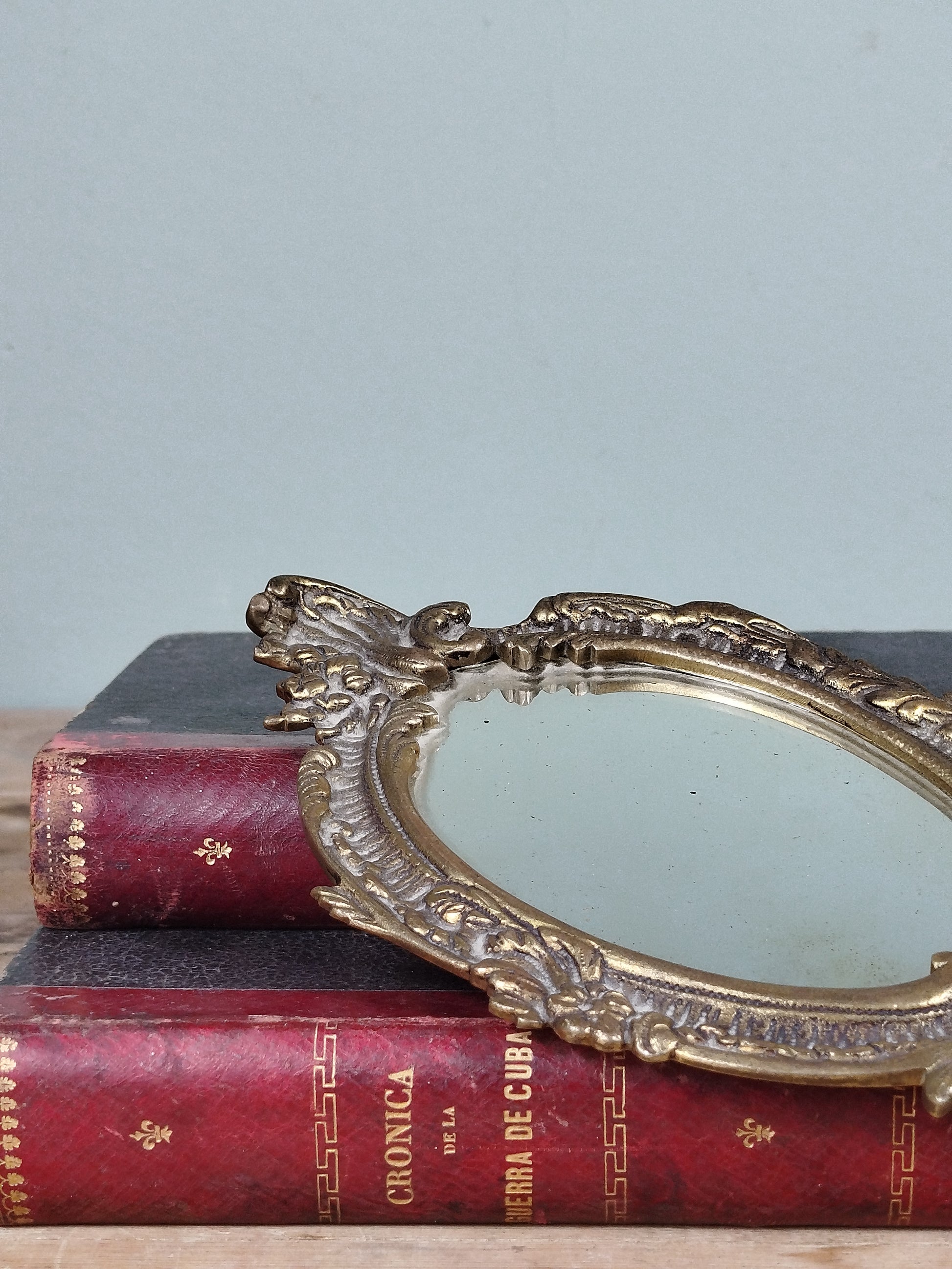 Este espejo de mano, elaborado en bronce con detalles ornamentales, evoca la delicadeza de los tocadores de época. Fue el reflejo de mujeres que cuidaban de sí mismas con rituales pausados y cotidianos. Sugerencia decorativa: Dimensiones: 27 x 11 cm