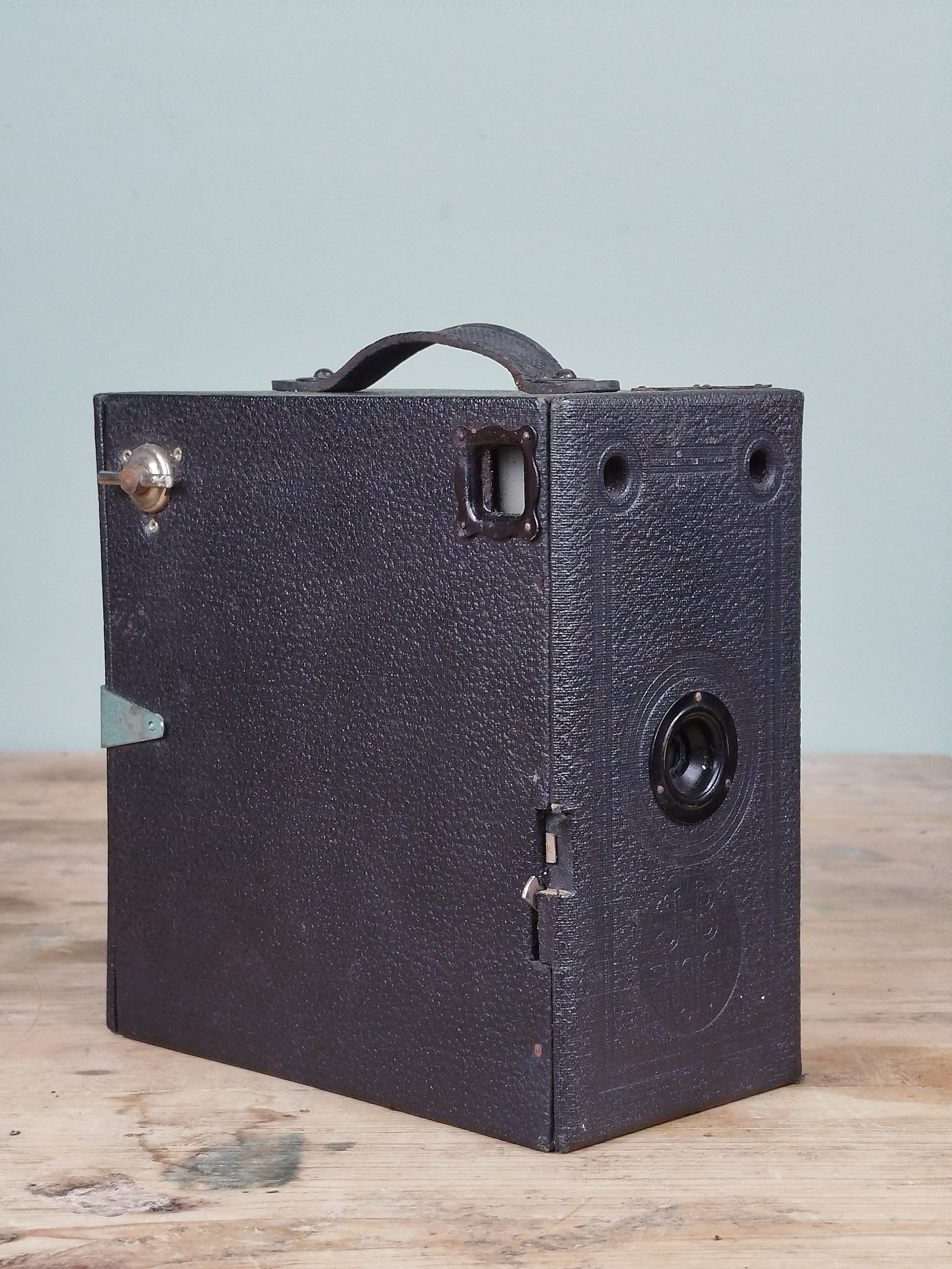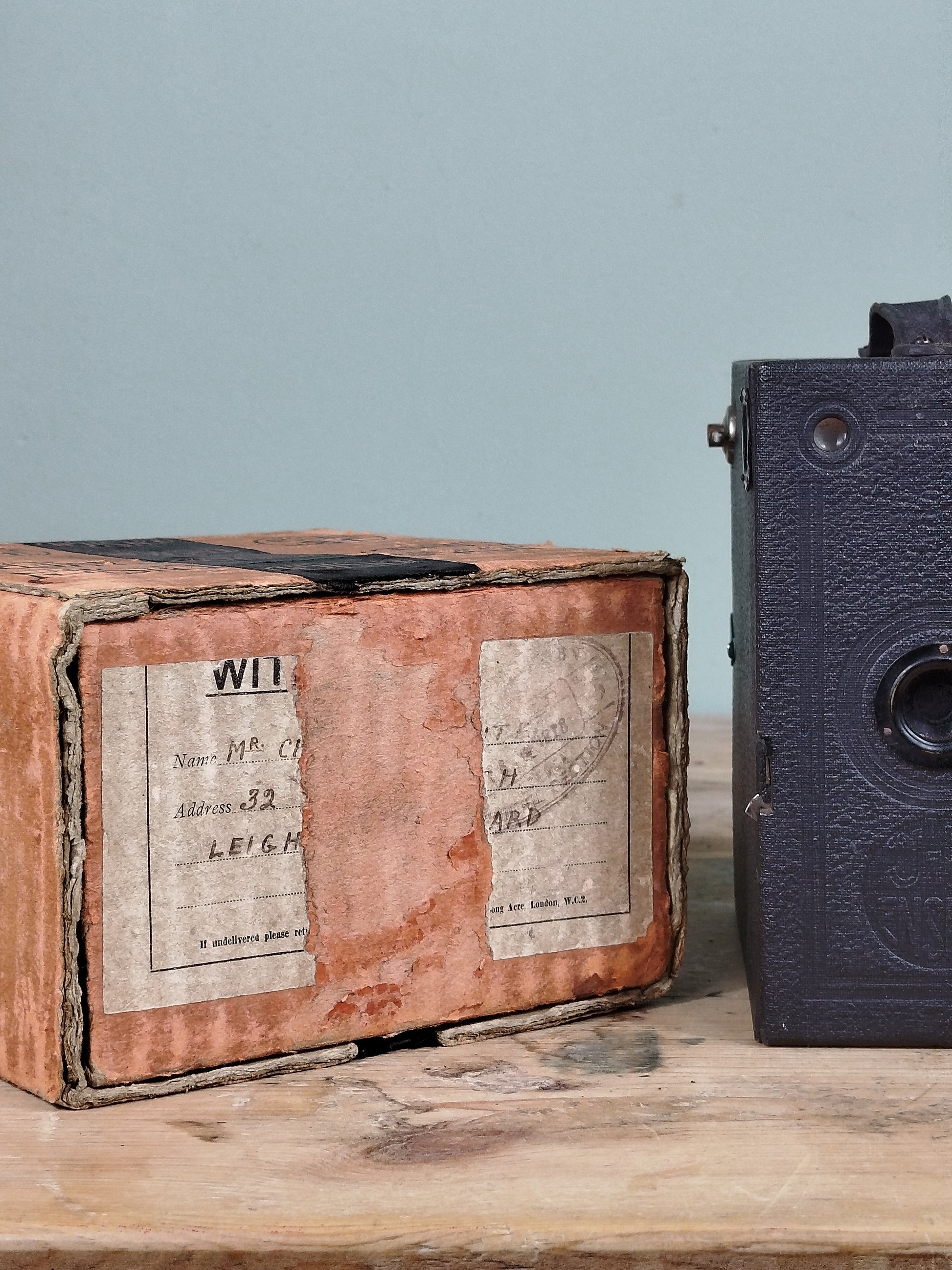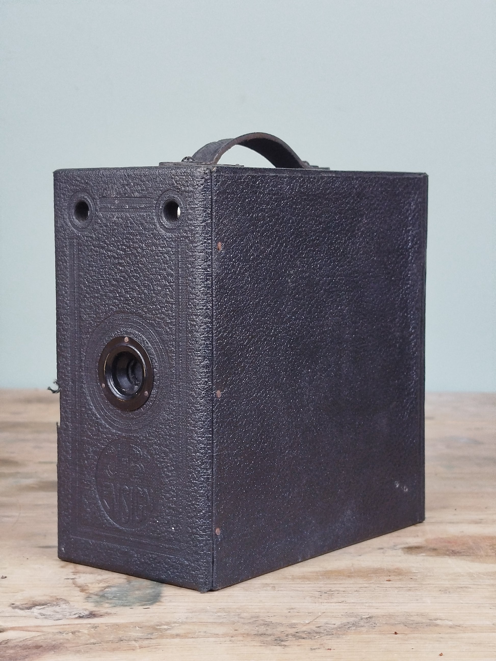Con una estética encantadora, esta cámara de caja inglesa ofrece un equilibrio entre elegancia y funcionalidad. Fabricada con materiales nobles, como el cuero y el metal, guarda en su interior el misterio de miles de imágenes que una vez capturó. Sugerencia decorativa: Dimensiones: 17 x 10,5 x 16 cm