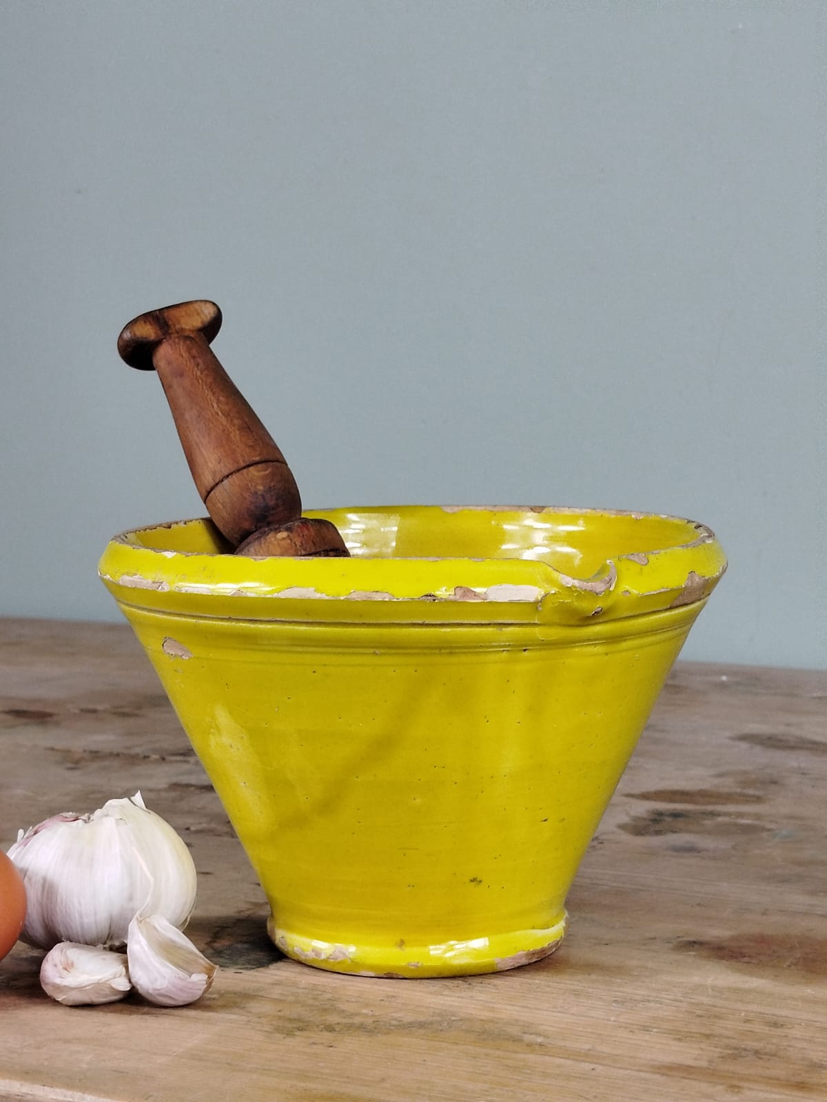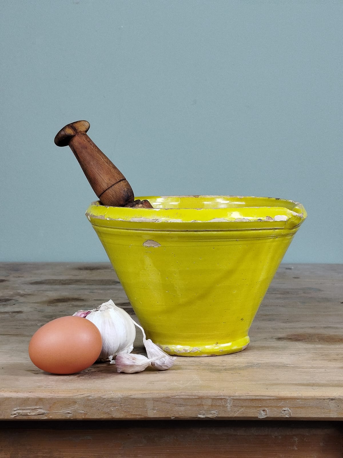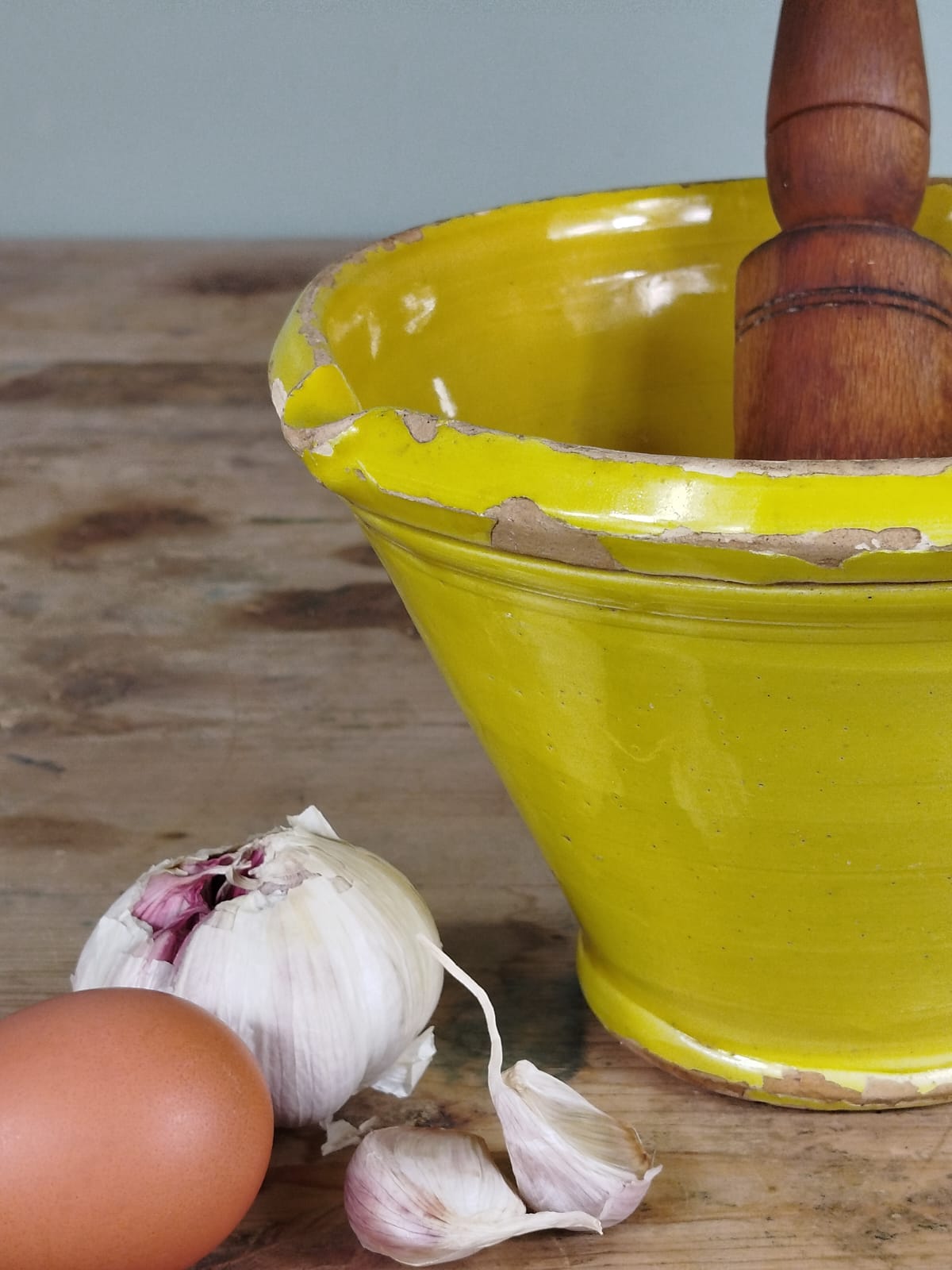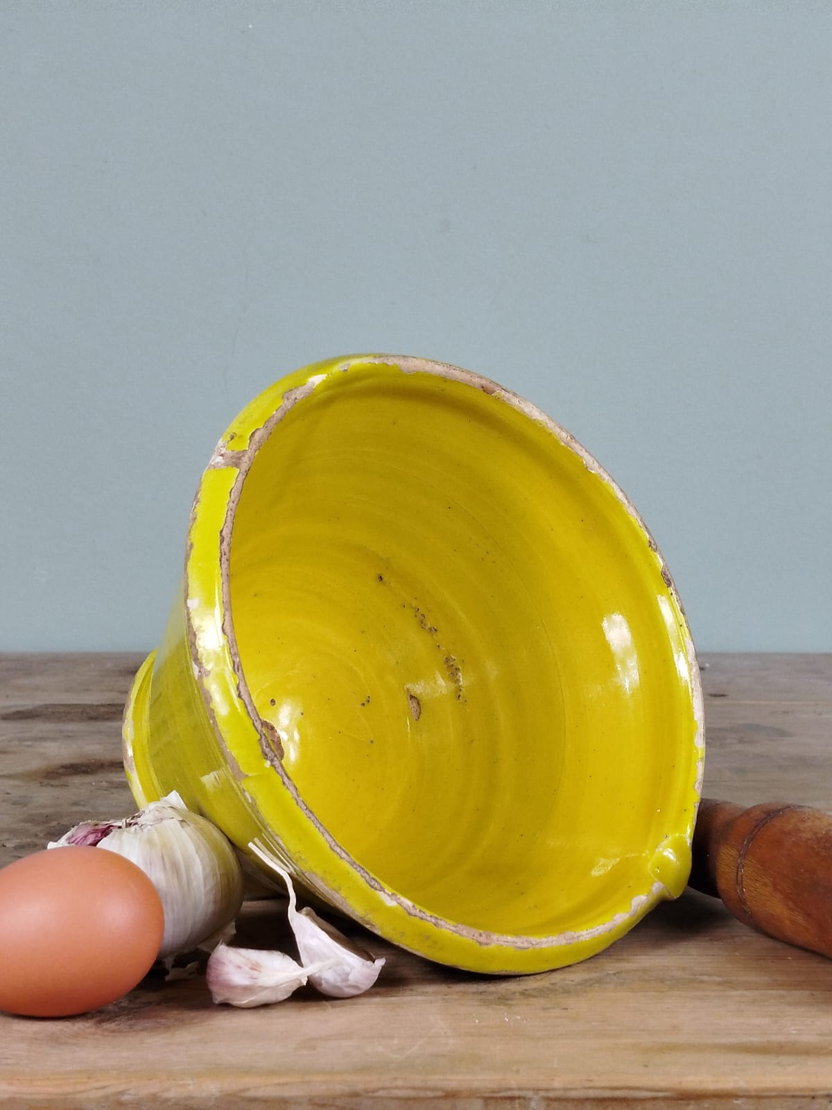 Este mortero de cerámica popular conserva la esencia de la cocina tradicional española. Utilizado en la molienda de especias o en la preparación de salsas, es un objeto cargado de historia. Ideal para cocinas rústicas o como pieza de exposición junto a otros utensilios antiguos.